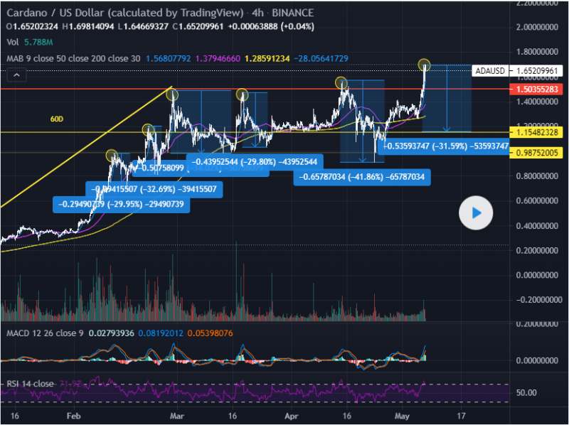 ADA's price has reached a new ATH while MACD is around 0.1 and RSI is overbought. Each time ADA's price has peaked in the past (on the 4HR chart) with the same MADC/ RSI condition, the price has corrected by ~30% not long after.
