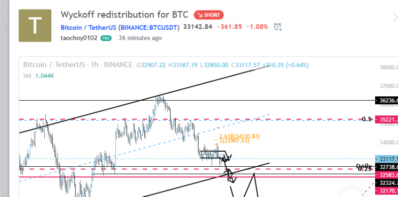 In the recent short term there was a wyckoff reaccumulation to the 200% fib target which couldn't hold a bullish retest of its buying climax. I will try to get a short in between 33.3k and 33.7k. Key level I'm setting buy orders for now are at 30.3k for what I think will be one last bearish retest before breaking down from the larger range.