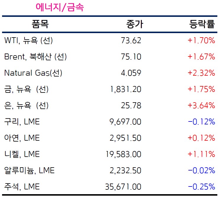 업종별로 통신과 부동산 관련주를 제외하고 S&P500지수에 9개 섹터가 모두 상승했다. 금융, 자재, 에너지 관련주가 1% 내외로 올라 상승을 주도했다.