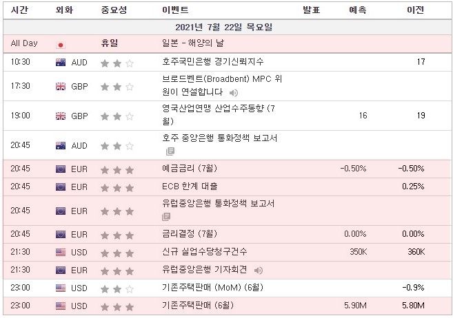 [21.07.22. 경제지표] 유로존 예금금리, 유럽중앙은행 통화정책보고서, 금리결정 / 미국 신규 실업수당청구건수, 기존주택…