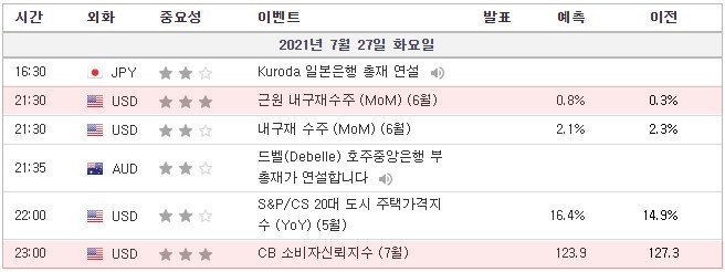[21.07.27. 경제지표] 미국 근원 내구재수주 / 드벨 호주중앙은행 부총재 연설 / 미국 CB 소비자신뢰지수