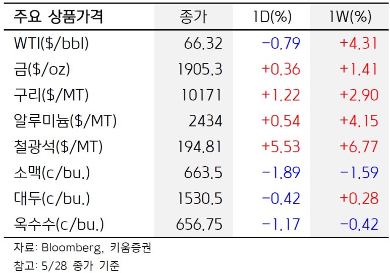국제유가는 OPEC+ 산유국 회의를 앞두고 주간 기준 4.31% 상승했다. 이란 핵합의 복귀 가능성에 공급 부담은 늘어난 상황이나 미국, 유럽의 이동제한 완화와 여름 휴가 시즌 수요 증가 기대가 높아진 영향이다. 또한 EIA가 발표한 미국의 주간 원유재고 및 석유 제품 재고가 감소한 점도 지난주 유가 상승 요인으로 작용했다. 한편, 금은 최근 미 10년물 국채금리가 안정되고 달러도 약세를 보인 영향에 상승 지속, 주간 기준 1.41% 상승하며 온스당 1,900달러 선으로 올라섰다.