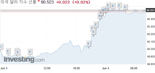 달러 인덱스는 4월에만 2% 하락했고 5월에도 1.6%가 떨어지는 등 최근 들어 약세 흐름을 강화해 왔다. 하지만 이날 달러 인덱스는 한때 전장보다 0.72% 상승한 90.550을 기록하는 등 3주 만의 최고치 수준까지 급등했다.