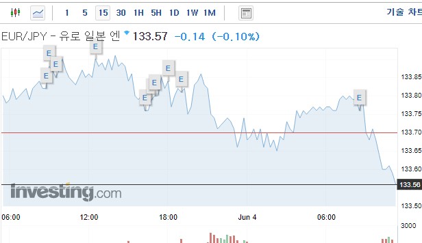 유로는 엔에 유로당 133.75엔을 기록, 전장 133.77엔보다 0.02엔(0.01%) 내렸다.