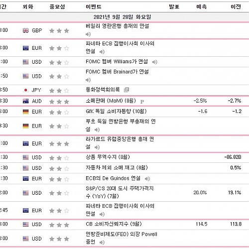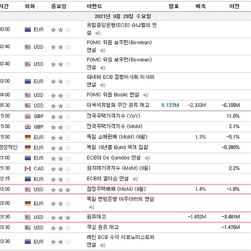 [21.09.29. 경제지표] 미국 잠정주택매매, 원유재고 / 베일리 영란은행 총재 연설 / 연준의장 파월 연설 / 라가르드 유럽중앙은행 총재 연설
