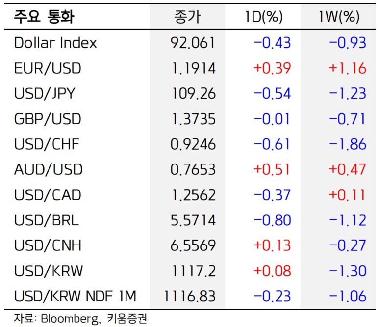 미 국채 수익률이 안정적인 흐름을 이어가면서 달러화 약세 요인으로 작용했다. 일자리 회복세가 주춤해지면서 미 국채 강세를 뒷받침했다. 지난 3일로 끝난 주간의 미국 실업보험 청구자 수는 팬데믹 이후 최저치에서 2주 연속 증가해 시장 예상을 웃돌았다.