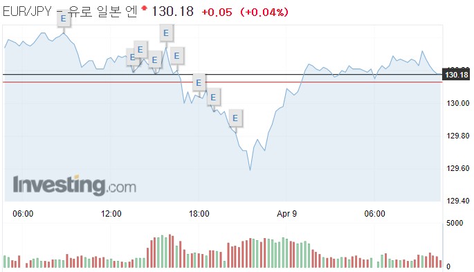 유로는 엔에 유로당 130.22엔을 기록, 전장 130.35엔보다 0.13엔(0.10%) 내렸다.