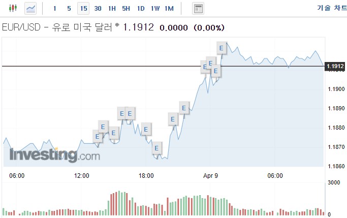유로화는 유로당 1.19135달러에 움직여, 전장 가격인 1.18720달러보다 0.00415달러(0.35%) 상승했다.
