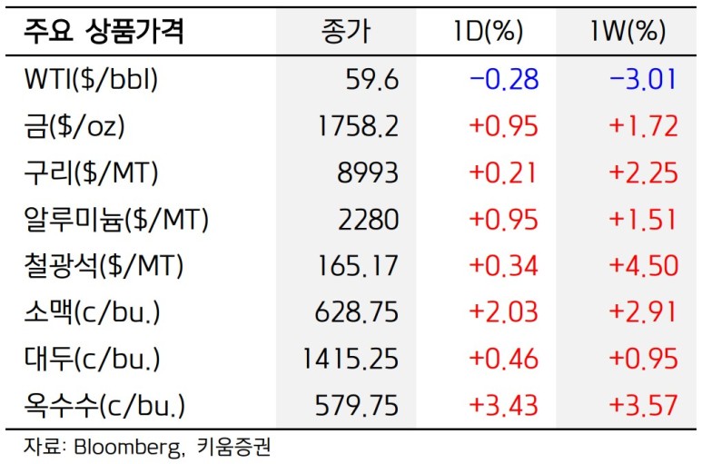 주요 원자재 상품 종가