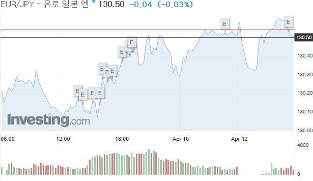 유로는 엔에 유로당 130.51엔을 기록, 전장 130.22엔보다 0.29엔(0.22%) 올랐다.