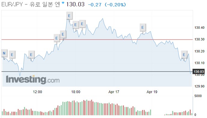 유로는 엔에 유로당 130.34엔을 기록, 전장 130.10엔보다 0.24엔(0.18%) 상승했다.
