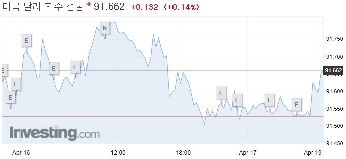 현재 주요 6개국 통화 대비 달러 가치를 나타내 주는 ICE 달러지수는 0.15% 내린 91.55에 거래되고 있다.