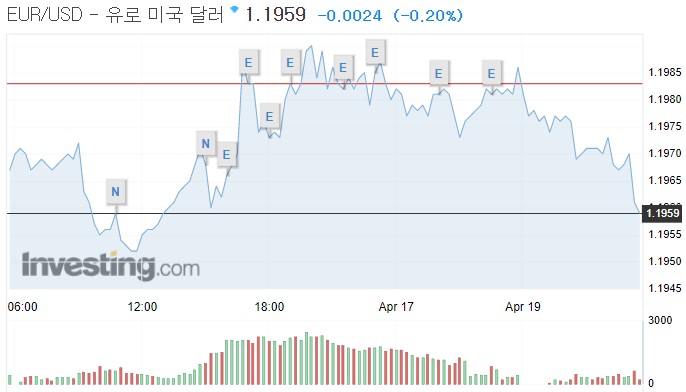 유로화는 유로당 1.19811달러에 움직여, 전장 가격인 1.19721달러보다 0.00090달러(0.08%) 올랐다.