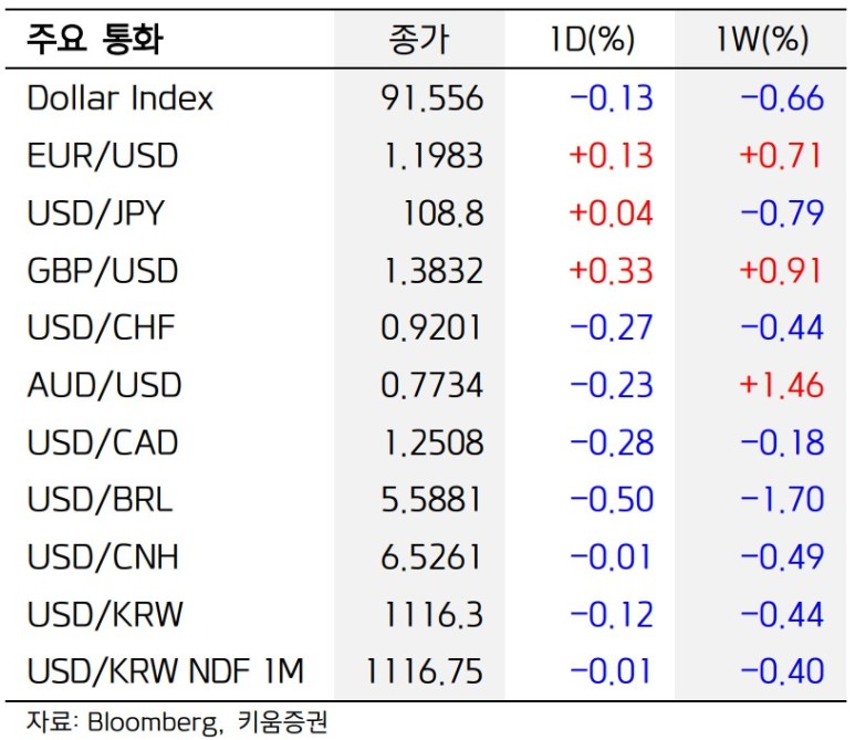 주요 6개 통화에 대한 달러 가치를 반영하는 달러 인덱스는 전장보다 0.11% 하락한 91.543을 기록했다. 달러 인덱스는 주간 단위로 0.67% 하락하면서 4주 만에 최저치까지 내려섰다.