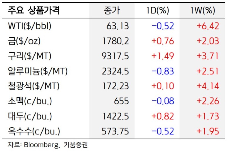 주요 원자재 상품 종가