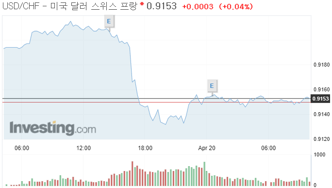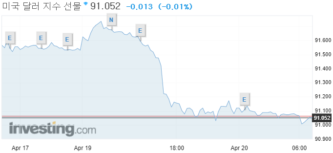 달러지수는 이날 91.019까지 하락해 3월 초 이후 최저치를 경신했다. 달러화는 미 국채금리가 최근 하락세를 보이면서 하락 압력을 받고 있다.