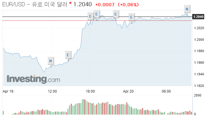 유로화는 유로당 1.20375달러에 움직여, 전장 가격인 1.19811달러보다 0.00564달러(0.47%) 상승했다.