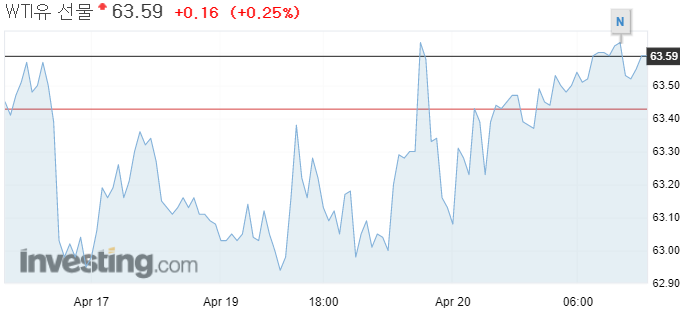 뉴욕상업거래소에서 5월물 서부텍사스산원유(WTI) 가격은 전장보다 25센트(0.4%) 오른 배럴당 63.38달러에 마감했다.