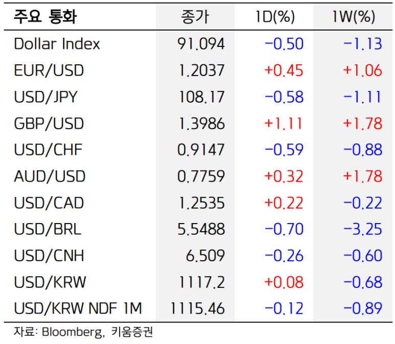주요 6개 통화에 대한 달러 가치를 반영하는 달러 인덱스는 전장보다 0.49% 하락한 91.095를 기록했다.