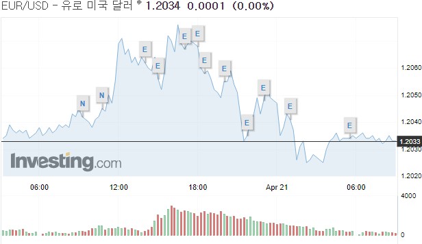 유로화는 아시아 시장에서 7주일 만에 최고치인 1.2065달러 수준까지 치솟은 뒤 뉴욕 환시에서 전날 종가 수준 아래로 내려서는 등 약세로 돌아섰다. 유로존의 인플레이션 압력도 강화될 것으로 점쳐졌다. 유로존 최대의 경제 규모를 가진 독일의 지난 3월 생산자물가지수(PPI)는 전월 대비 0.9% 올랐다. 시장은 0.6% 증가를 예상했다.