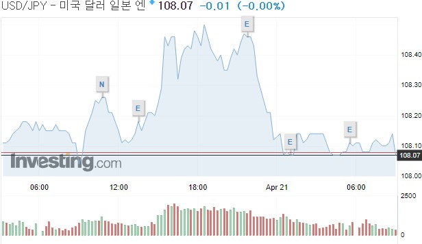 달러-엔 환율은 미 국채 수익률 하락과 안전 선호 현상 등을 반영하면서 지난달 5일 이후 처음으로 108엔이 아래로 뚫리는 등 하락세를 보였다. 달러-엔 환율 하락은 엔화가 달러화에 대해 강해졌다는 의미다. 달러-엔은 미 국채 수익률에 민감하게 반응하며 지난달 말 한때 110.965엔까지 치솟았다가 최근 108엔대로 반락했다.