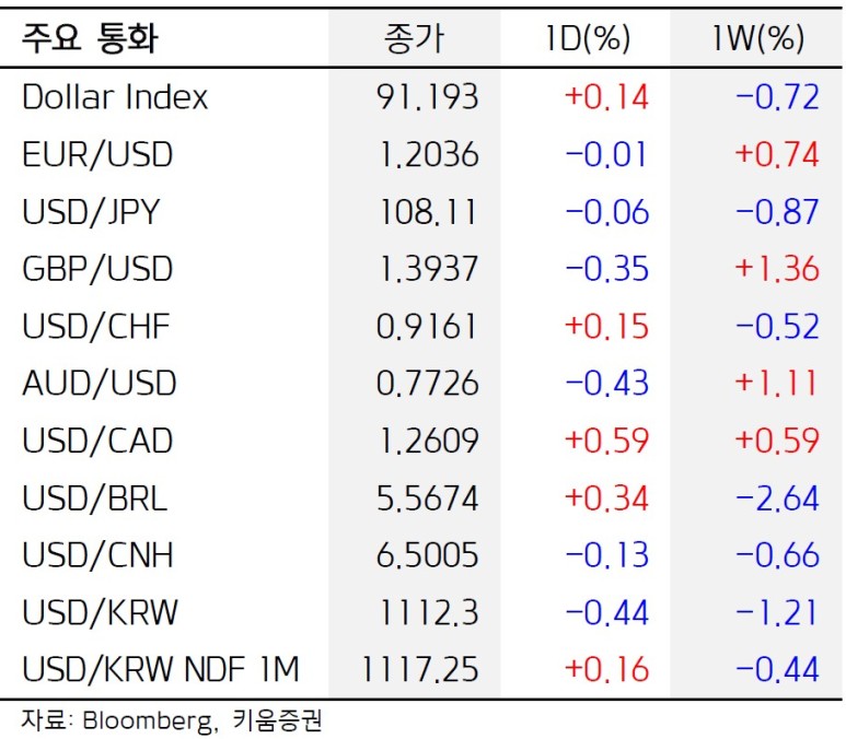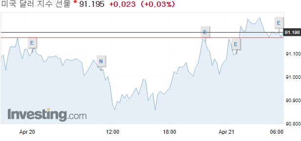 뉴욕 증시에서 3대지수는 모두 하락하고 있고 현재 주요 6개국 통화 대비 달러 가치를 나타내 주는 ICE 달러지수는 0.19% 오른 91.24에 거래되고 있지만 최근 계속 낮은 수준에서 움직이고 있다.