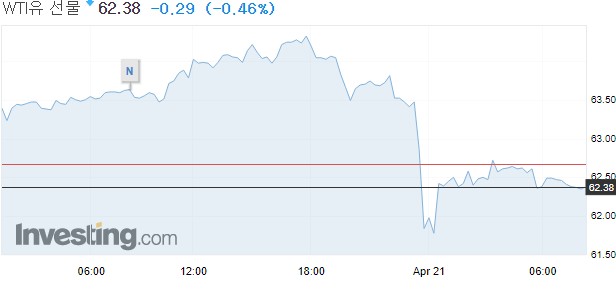 뉴욕상업거래소에서 5월물 서부텍사스산원유(WTI) 가격은 전장보다 94센트(1.5%) 하락한 배럴당 62.44달러에 마감했다. WTI 5월물은 이날이 만기일이다.