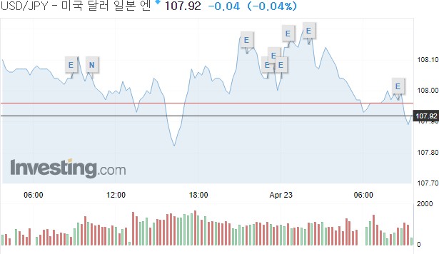22일(이하 미 동부 시각) 오후 4시 뉴욕 외환시장에서 달러화는 108.030엔을 기록, 전장 뉴욕 후장 가격인 108.057엔보다 0.027엔(0.02%) 하락했다.