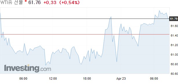 뉴욕상업거래소에서 6월물 서부텍사스산원유(WTI) 가격은 전장보다 8센트(0.1%) 하락한 배럴당 61.43달러에 마감했다.