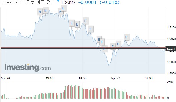 유로화는 유로당 1.20896달러에 움직여, 전장 가격인 1.20996달러보다 0.00100달러(0.08%) 하락했다.
