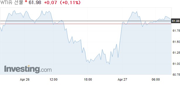 뉴욕상업거래소에서 6월물 서부텍사스산원유(WTI) 가격은 전장보다 23센트(0.4%) 하락한 배럴당 61.91달러에 마감했다.