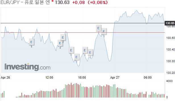 유로는 엔에 유로당 130.71엔을 기록, 전장 130.55엔 대비 0.16엔(0.12) 상승했다.