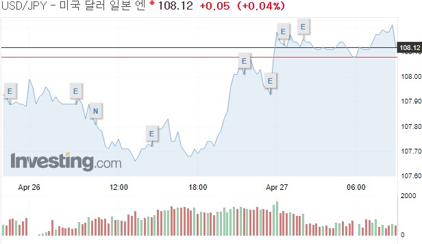 26일(미국시간) 오후 4시 뉴욕 외환시장에서 달러화는 108.125엔을 기록, 전장 뉴욕 후장 가격인 107.895엔보다 0.230엔(0.21%) 상승했다.