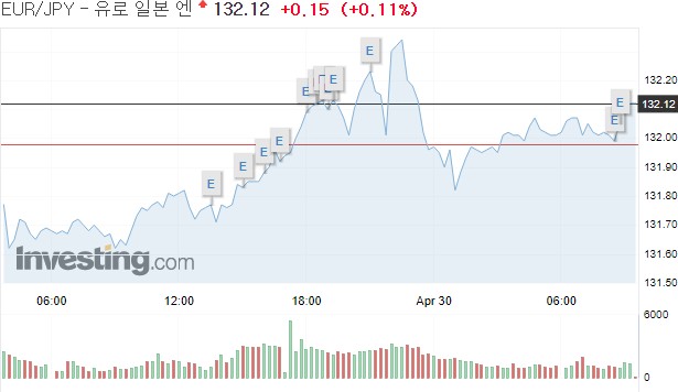 유로는 엔에 유로당 132.07엔을 기록, 전장 131.72엔보다 0.35엔(0.27%) 올랐다.