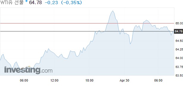 이날 뉴욕상업거래소에서 6월물 서부텍사스산원유(WTI) 가격은 전장보다 1.15달러(1.8%) 오른 배럴당 65.01달러에 마감했다.