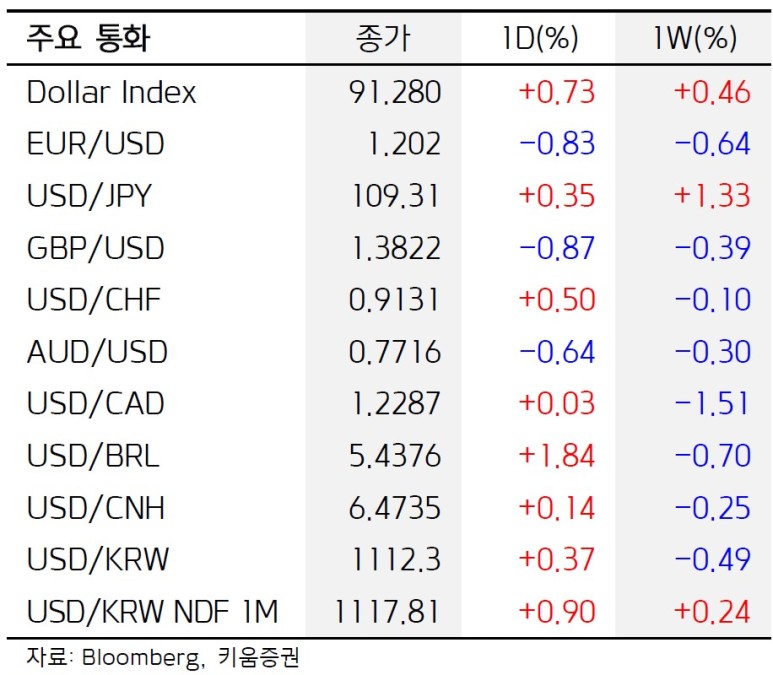 주요 6개 통화에 대한 달러 가치를 반영하는 달러 인덱스는 전장보다 0.76% 상승한 91.284를 기록했다. 원가는 단위로는 2.07% 하락했다.