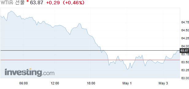 뉴욕상업거래소에서 6월물 서부텍사스산원유(WTI) 가격은 전장보다 1.43달러(2.2%) 하락한 배럴당 63.58달러에 거래를 마쳤다.