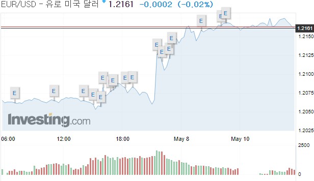 유로화는 유로당 1.21677달러에 움직여, 전장 가격인 1.20650달러보다 0.01027달러(0.85%) 상승했다.