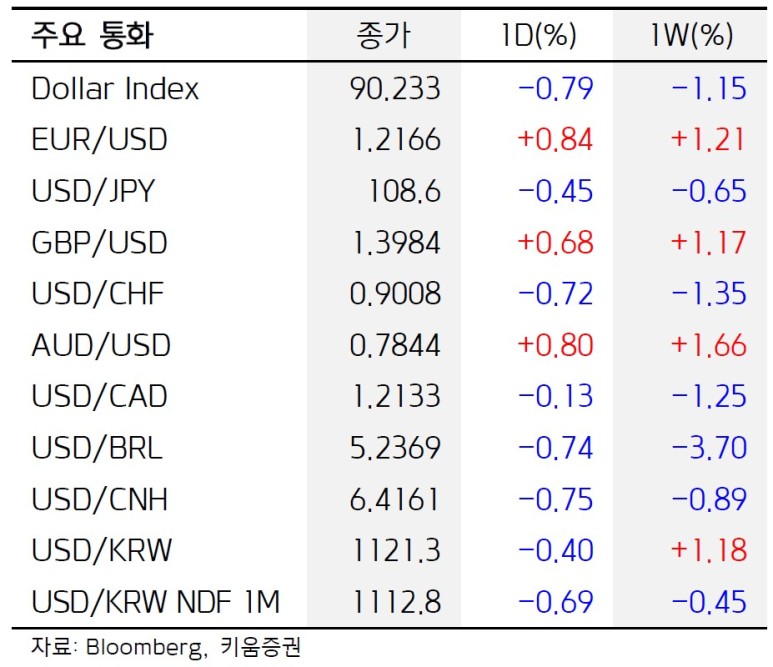 주요 6개 통화에 대한 달러 가치를 반영하는 달러 인덱스는 전장보다 0.74% 하락한 90.211을 기록했다. 주간 단위로는 1.18%나 하락했다.