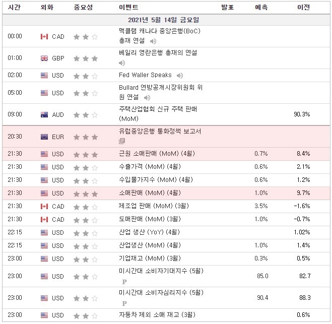 [21.05.14. 경제지표] 유럽중앙은행 통화정책 보고서 / 미국 근원소매판매 · 산업생산 · 미시간대 소비자심리지수 / 베…