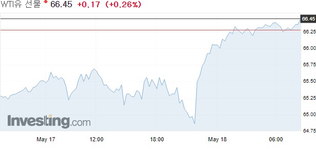 뉴욕상업거래소에서 6월물 서부텍사스산원유(WTI) 가격은 전장보다 90센트(1.4%) 오른 배럴당 66.27달러에 거래를 마쳤다.
