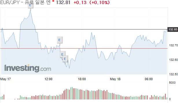 유로는 엔에 유로당 132.72엔을 기록, 전장 132.77엔보다 0.05엔(0.04%) 하락했다.