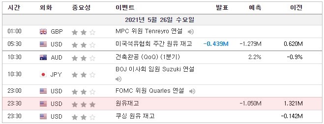 [21.05.26. 경제지표] 호주 건축완공 / 미국 FOMC 위원 Quarles(퀼스) 연설 / 원유재고