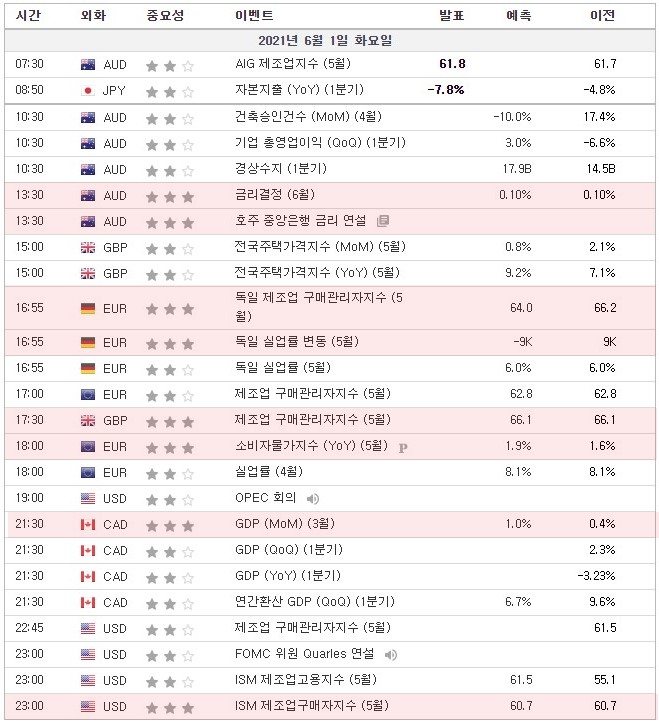 [21.06.01. 경제지표] 호주 금리결정 / 독일,영국 제조업구매관리자지수(PMI) / 유럽 소비자물가지수/캐나다GDP/미…