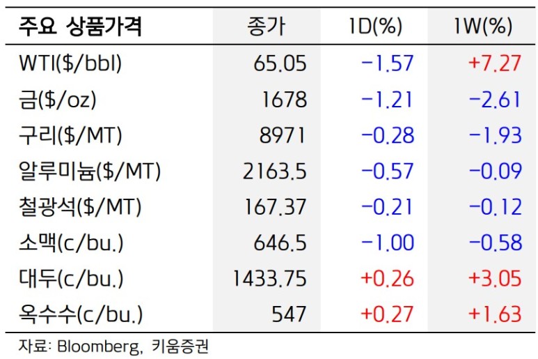 주요 원자재 상품 종가