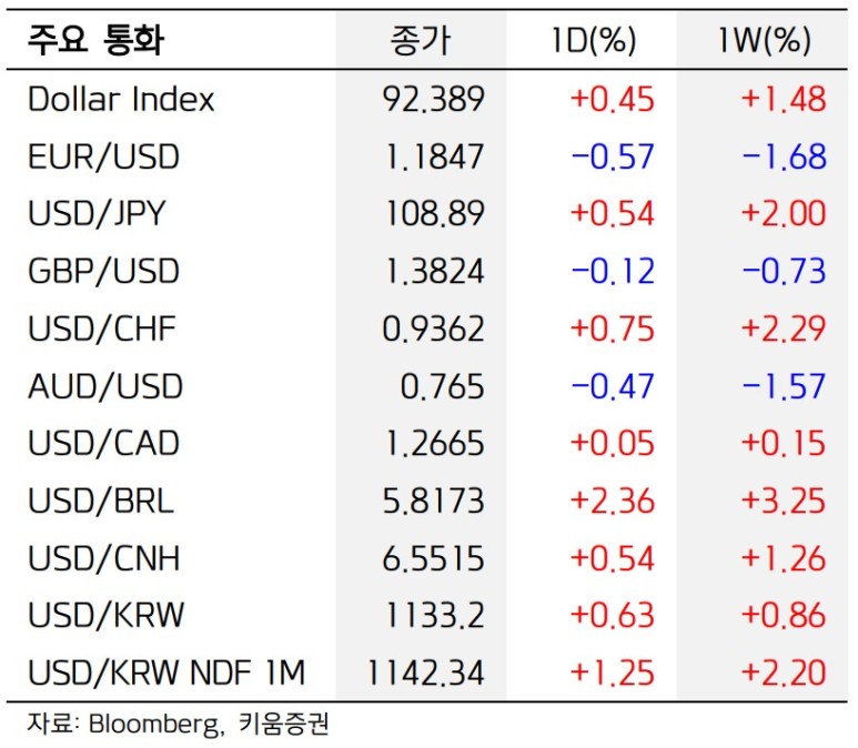 미 국채 금리가 상승하면서 달러 가치도 최근 상승세를 이어가는 중이다. 주요 통화 대비 달러 가치를 나타내는 달러인덱스는 이달 초 90선을 하회했던 데서 이날 92위로 올랐다.