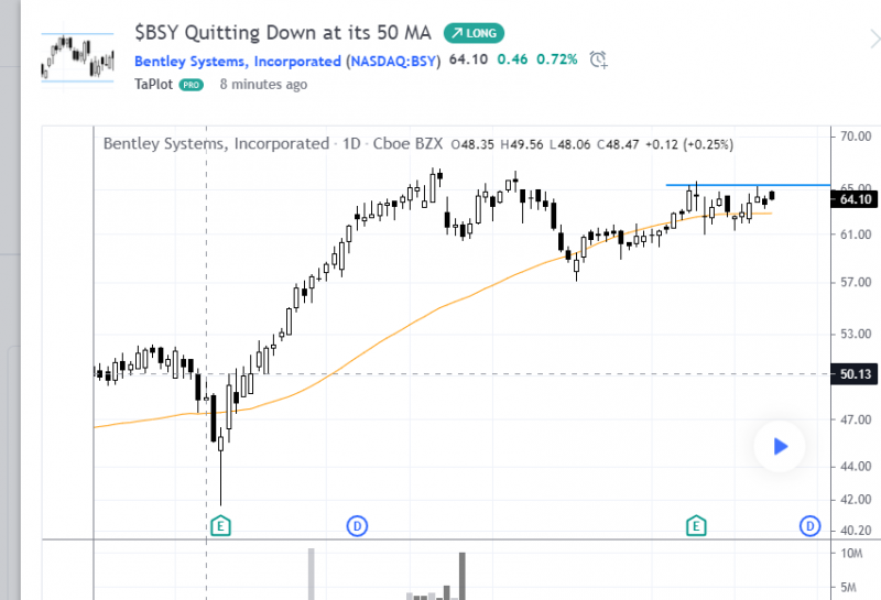Not seeing a whole lot of charts tight on that right hand side. I'll leave you with $BSY for tonight. Like how it is setting up that base on the 50 MA. Can't not notice that big volume sell at previous high but its quitting down nicely. Need to close above $65.