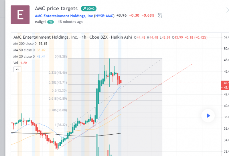 Fib retracements show areas of support for AMC . If supports does not hold then it will fall to the next fib line where a bounce will likely occur.