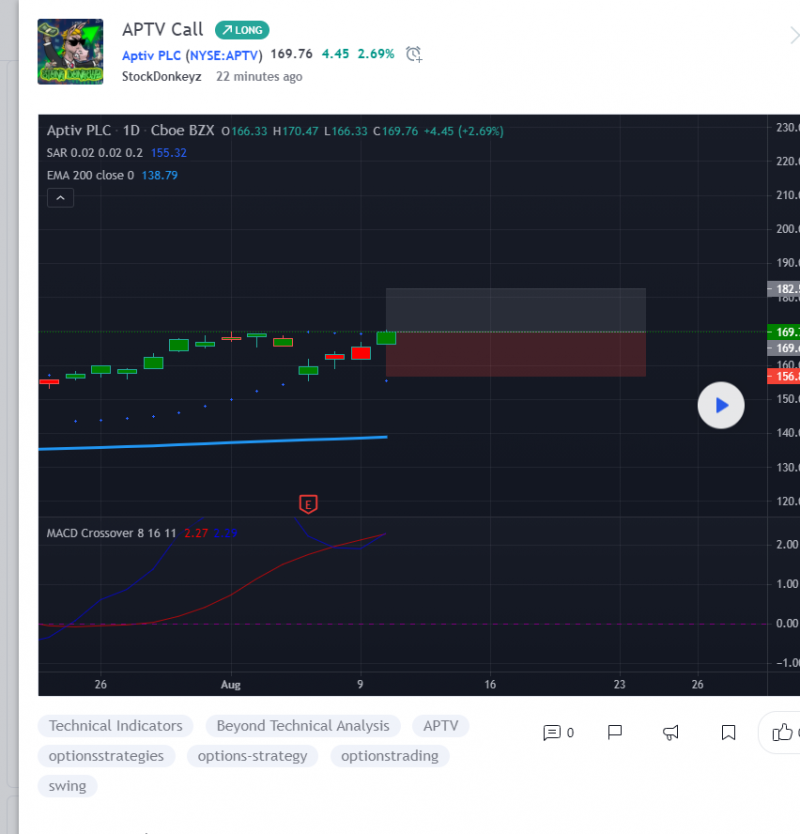 Expiration 8-20. $175 call. Spreads are looking pretty decent. Sitting comfortably above the 200 EMA with a parabolic sars twinkling like stars upon the chart. And our favorite MACD dominating over the signal line. I believe that APTV had a move all the way up to $180 if all goes well.