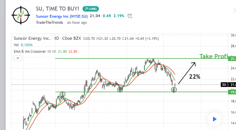 Hello, fellow traders and investors SU and other oil & gas companies have sold off in the past weeks and they look like interesting buying opportunities. My personal favorite is suncor since it offers a good ROI and they are slightly profitable, unlike many others. If SU makes a recovery to the take-profit area it offers a 22% ROI .